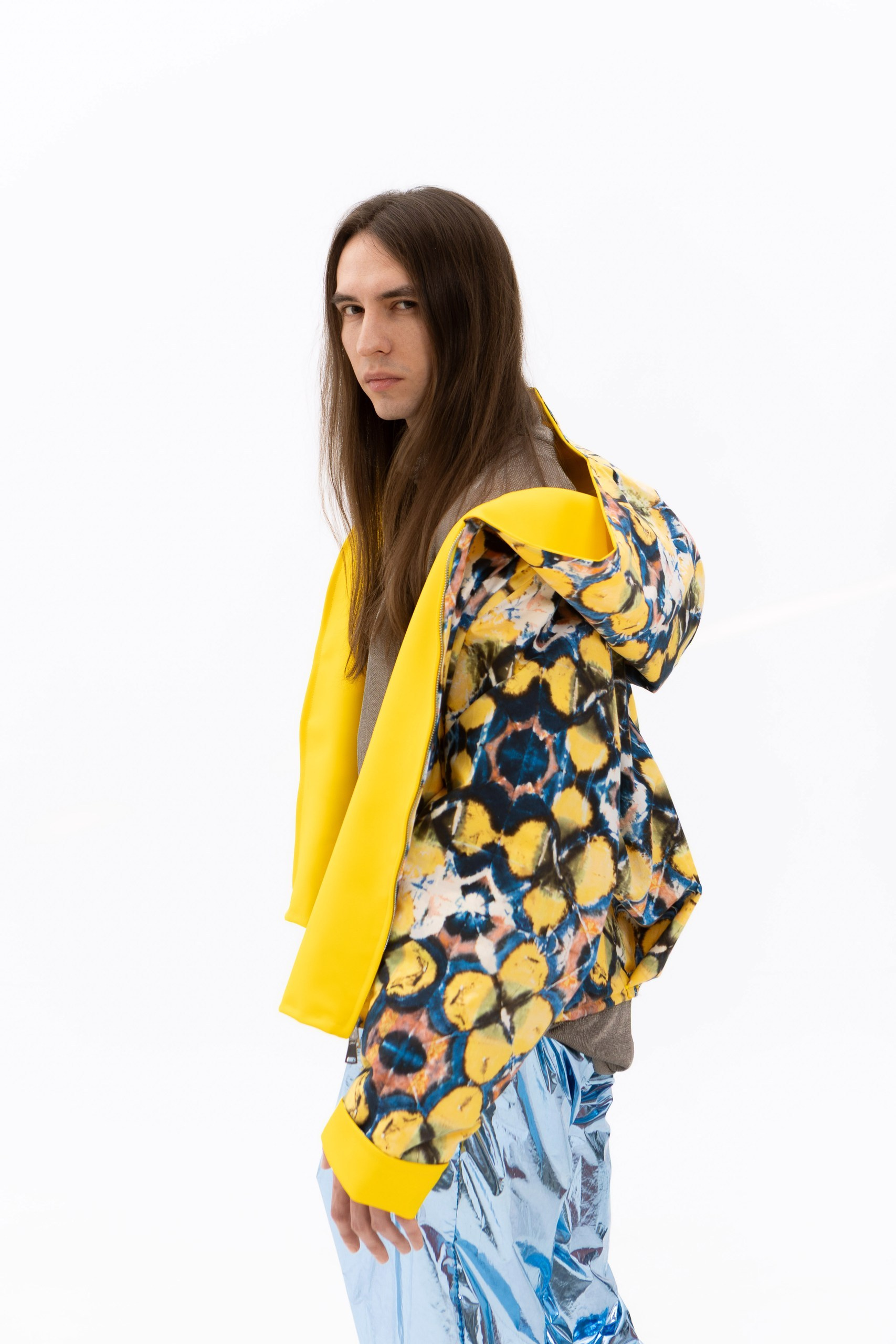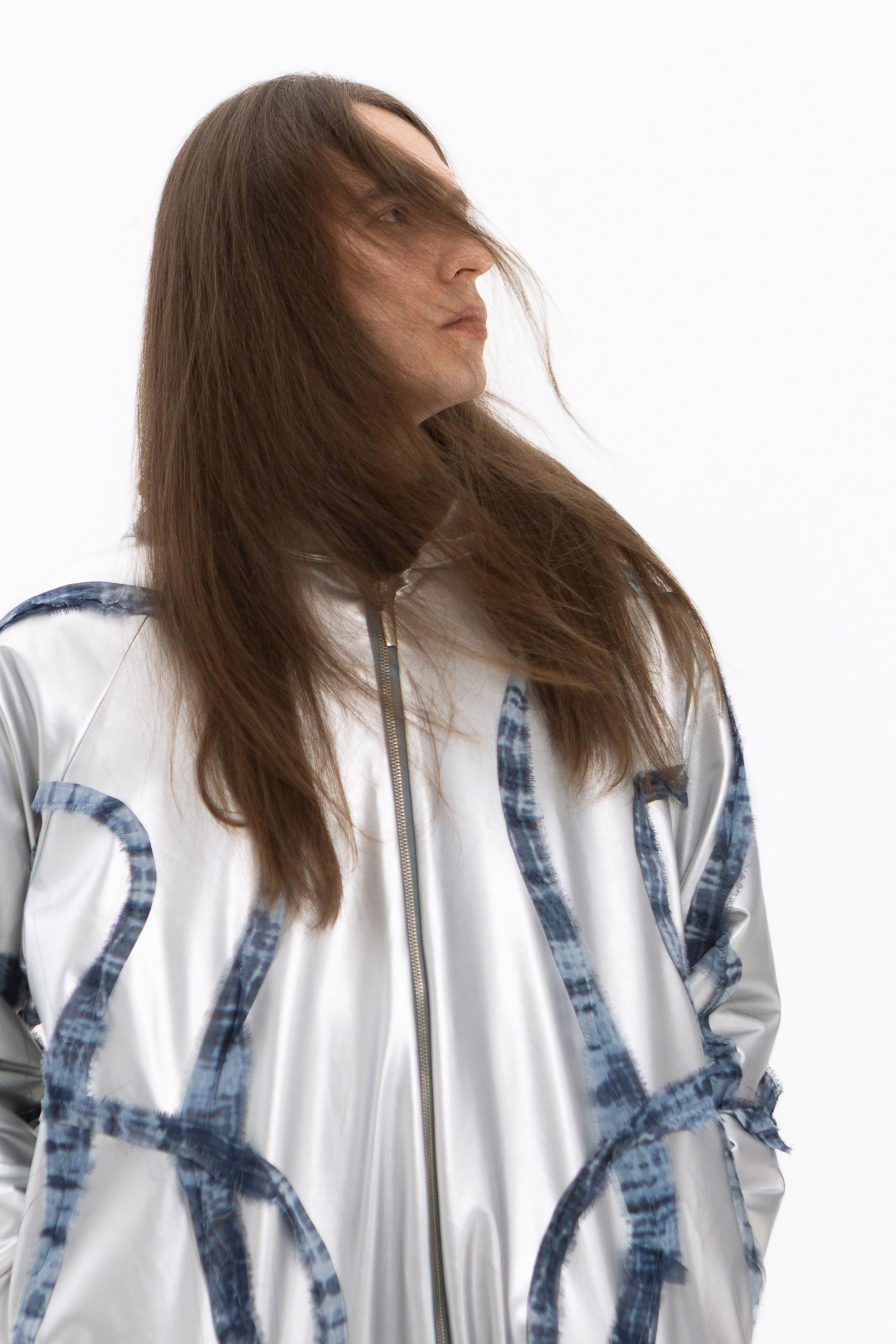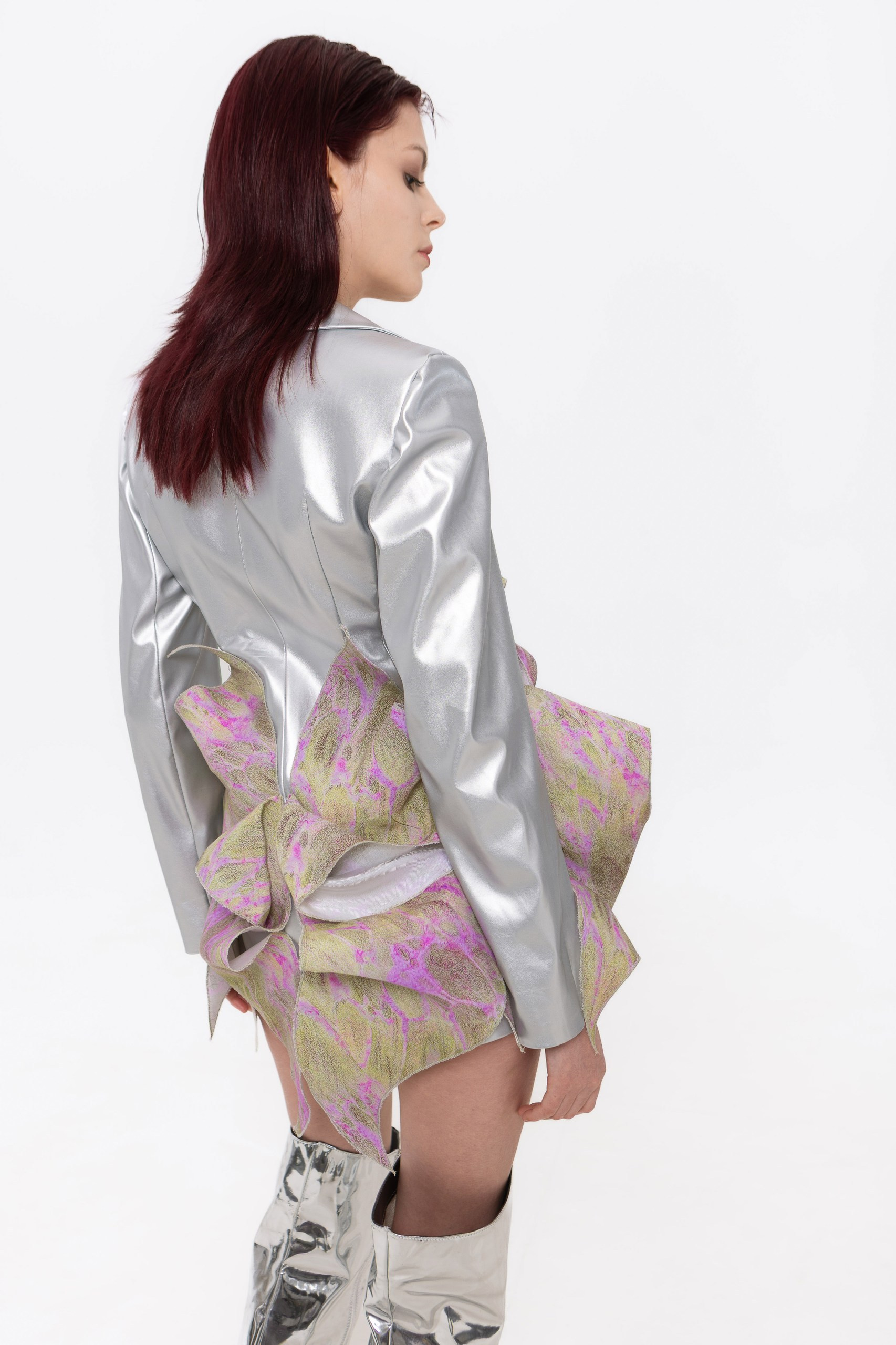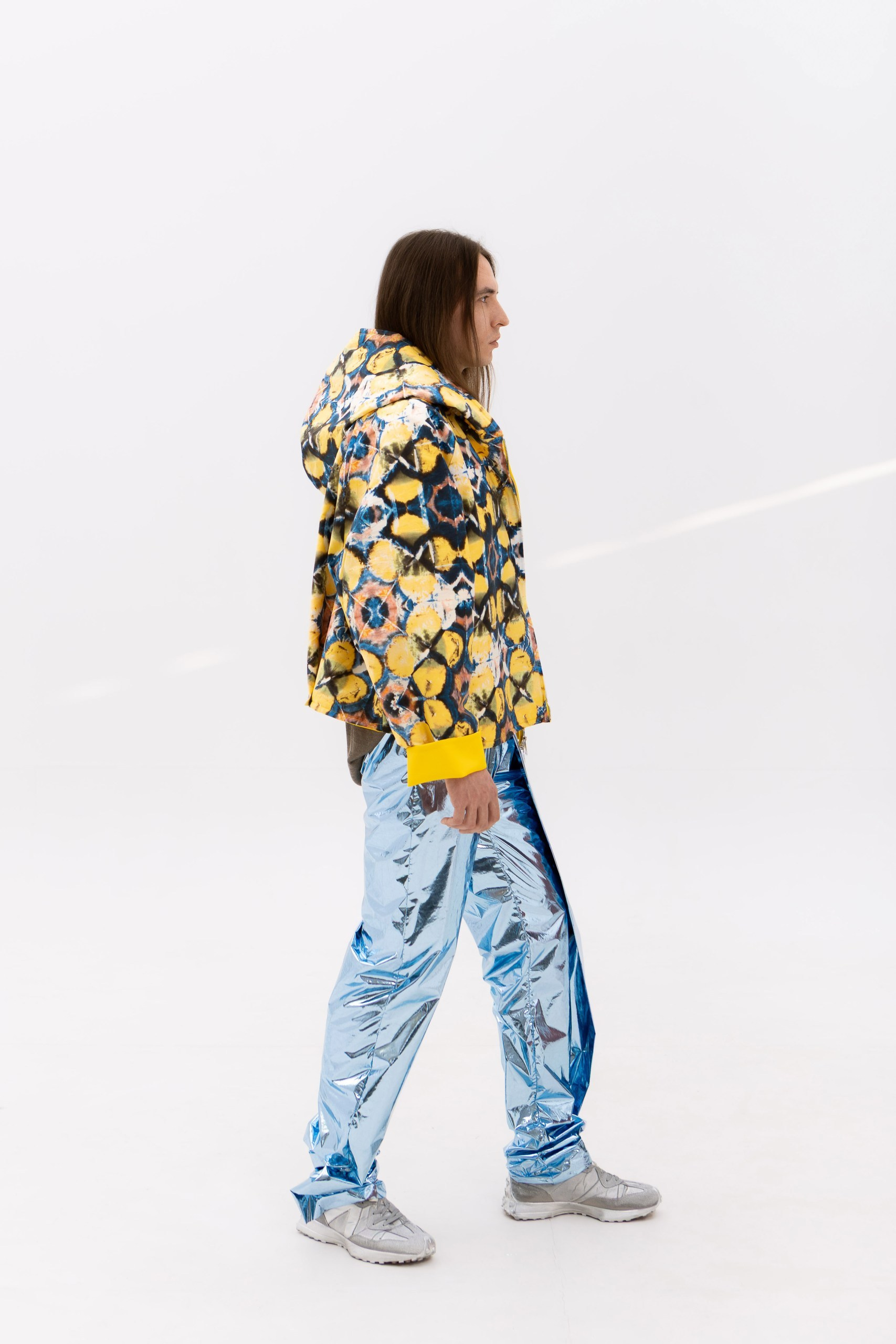 В основе коллекции — эклектика футуризма и экологичности. Нарочито искусственные фактуры, металлизированные поверхности, хромовые оттенки и визуальная «пластичность» тканей соединяются с натуральными, природными и этническими принтами. Полурастительные, полуорганические мотивы вплетаются в футуристичные формы, создавая ощущение трансформации и переходного состояния между естественным и сконструированным. «Слияние» не противопоставляет эти начала, а стирает между ними границы, формируя новую визуальную реальность, в которой искусственное становится продолжением природного, а природное — частью технологичной формы.