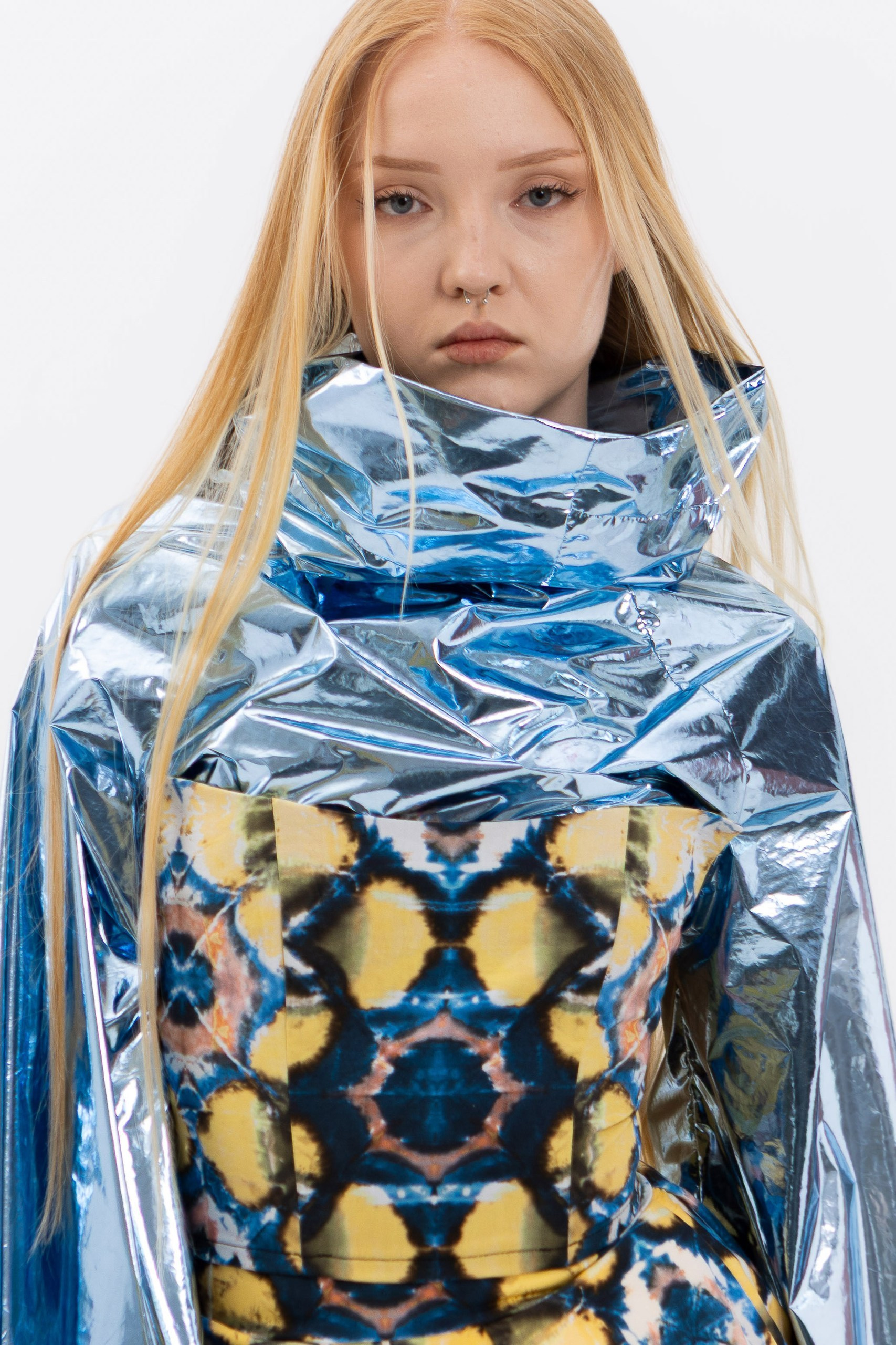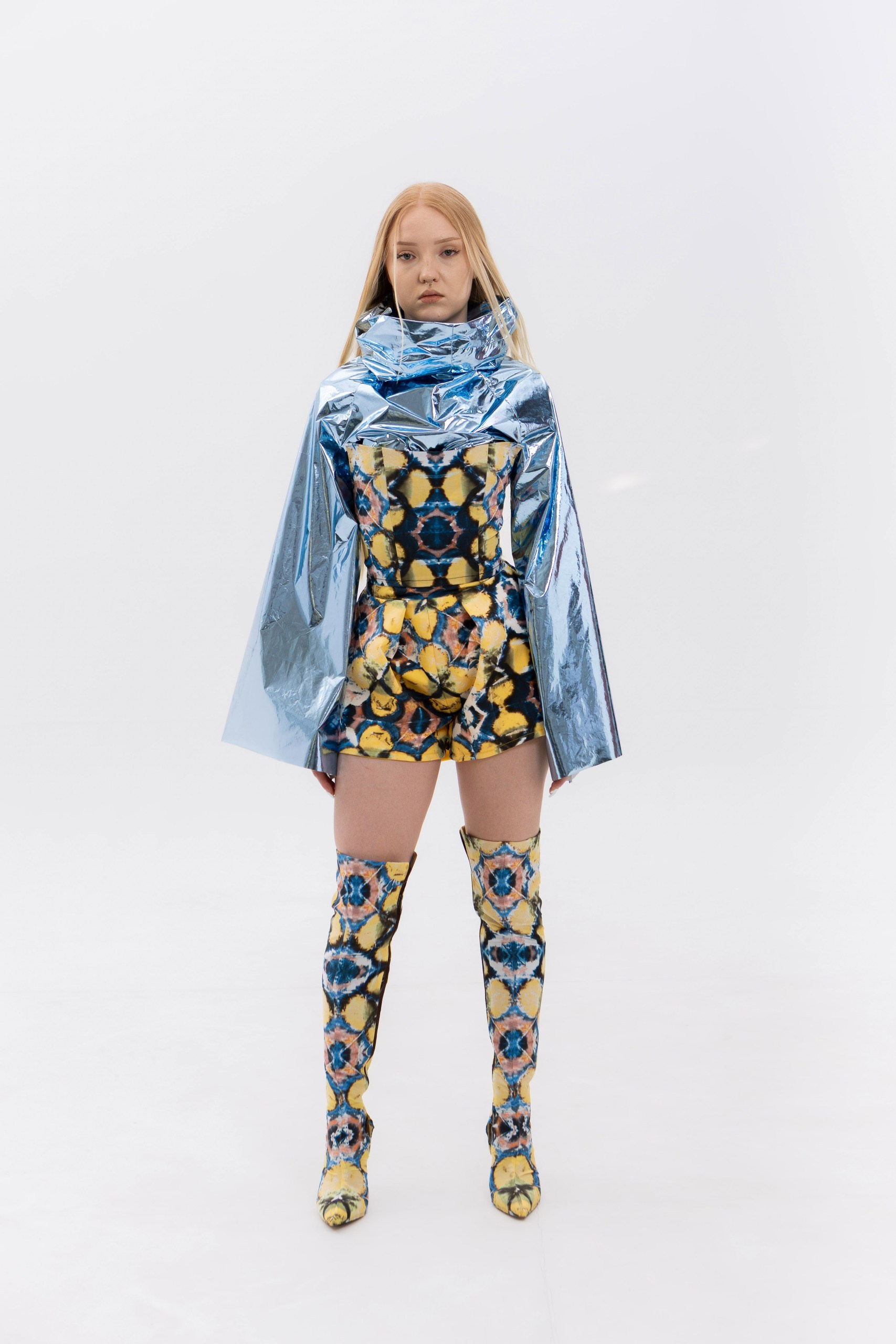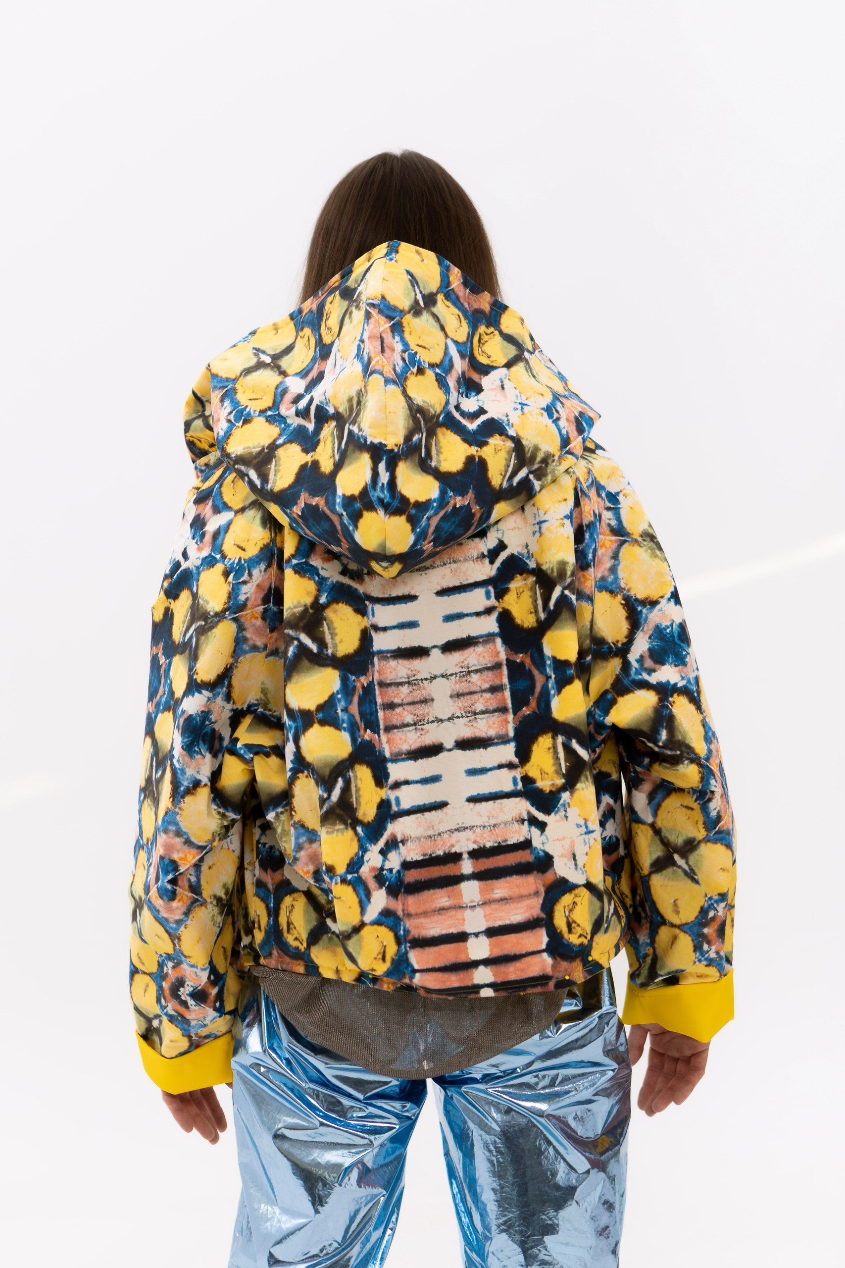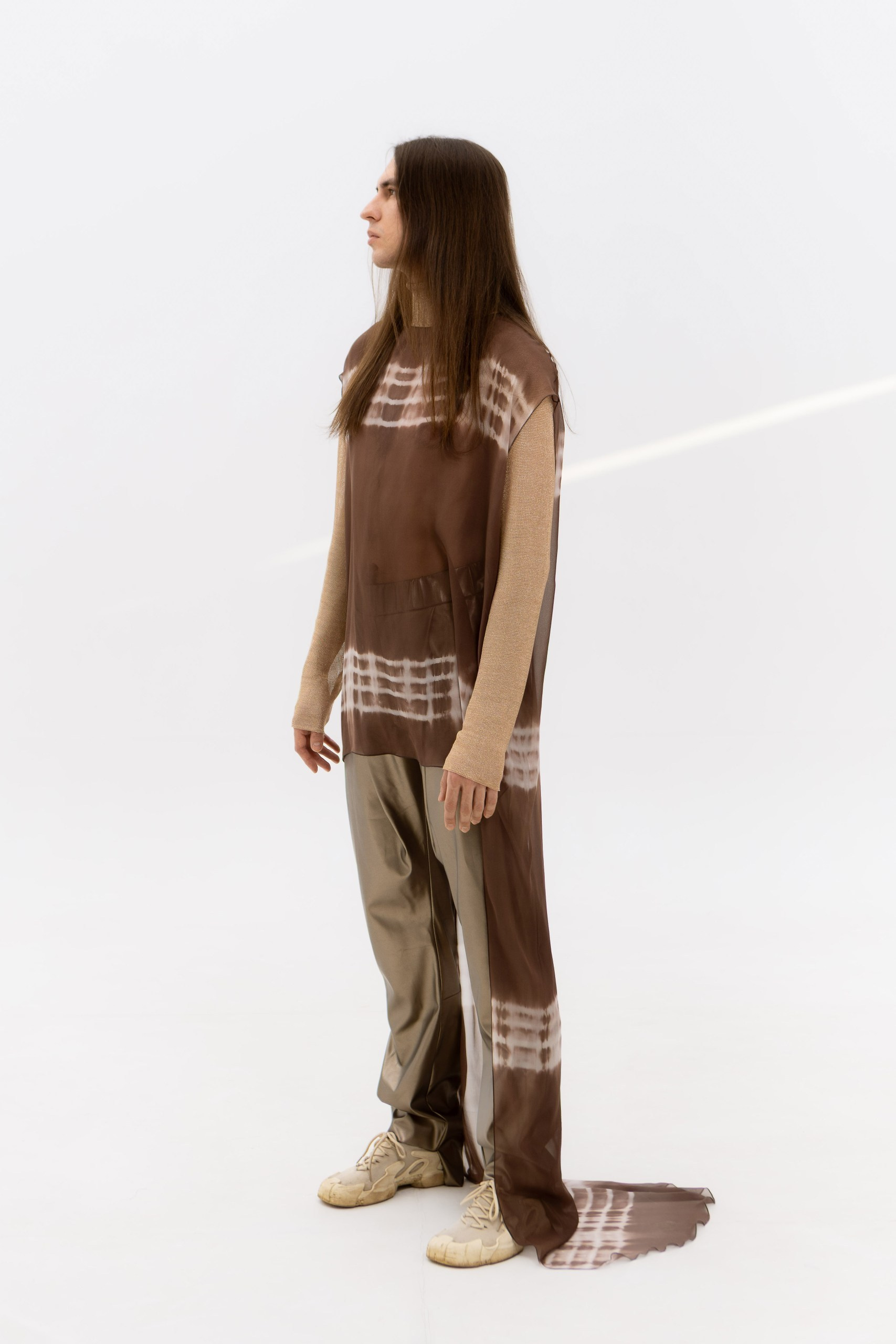В основе коллекции — эклектика футуризма и экологичности. Нарочито искусственные фактуры, металлизированные поверхности, хромовые оттенки и визуальная «пластичность» тканей соединяются с натуральными, природными и этническими принтами. Полурастительные, полуорганические мотивы вплетаются в футуристичные формы, создавая ощущение трансформации и переходного состояния между естественным и сконструированным. «Слияние» не противопоставляет эти начала, а стирает между ними границы, формируя новую визуальную реальность, в которой искусственное становится продолжением природного, а природное — частью технологичной формы.
