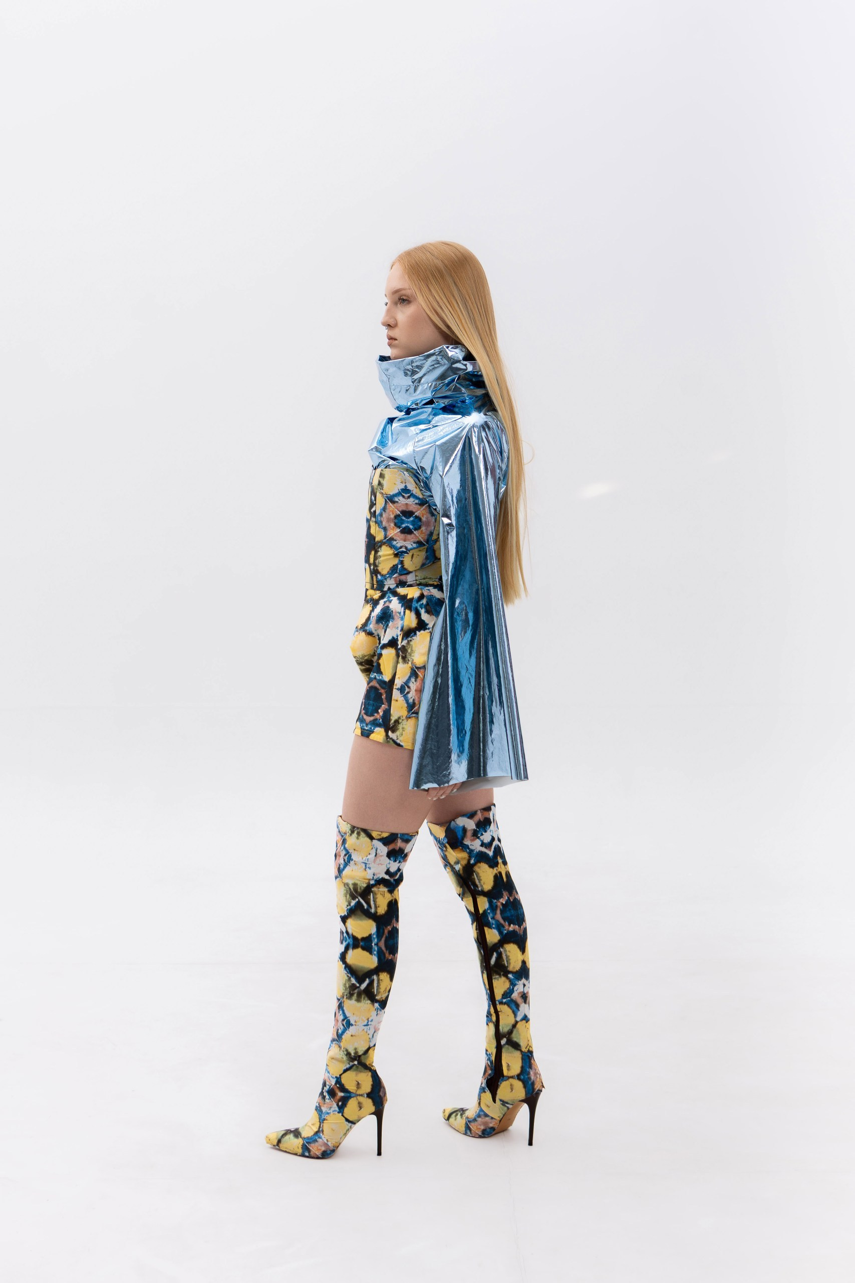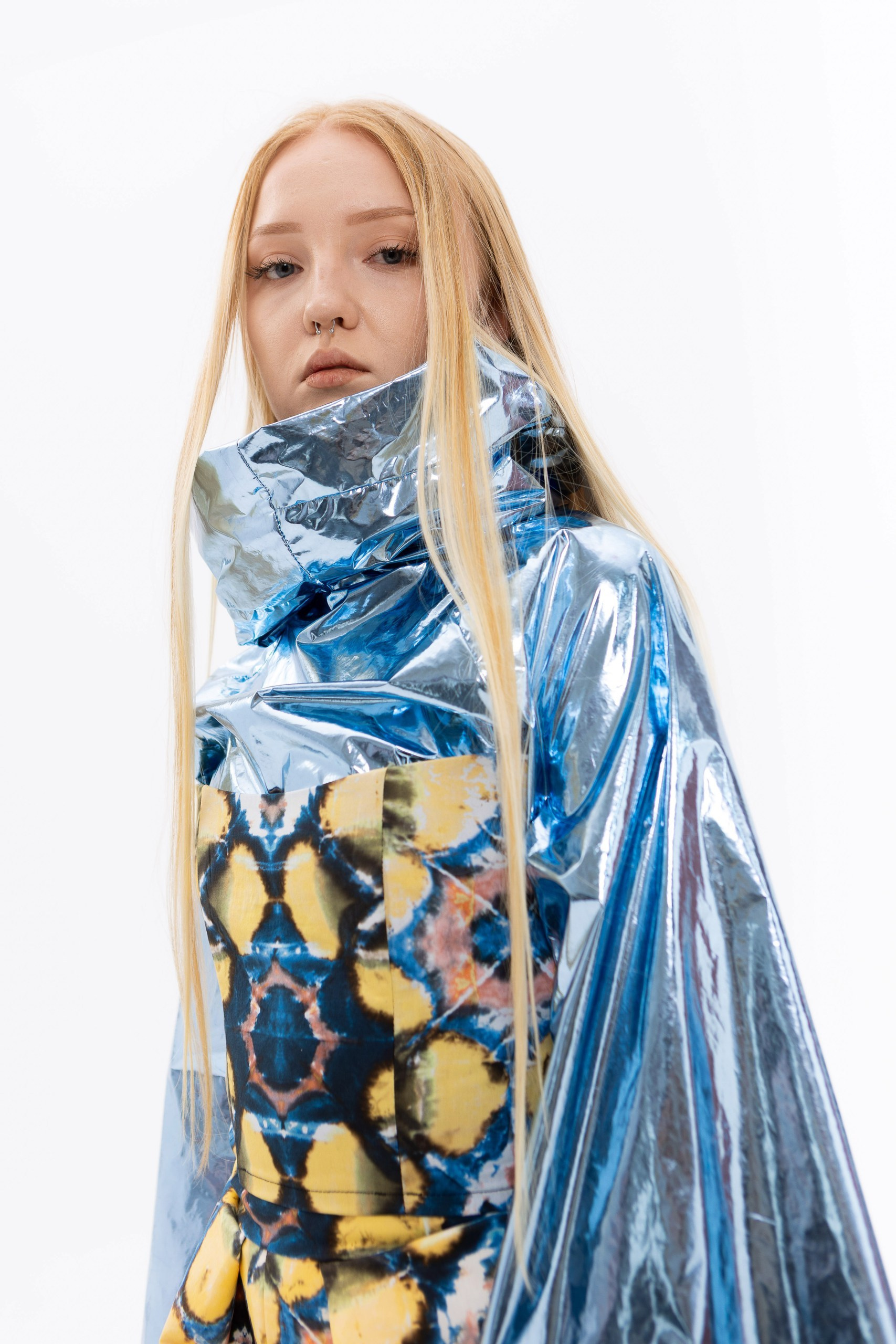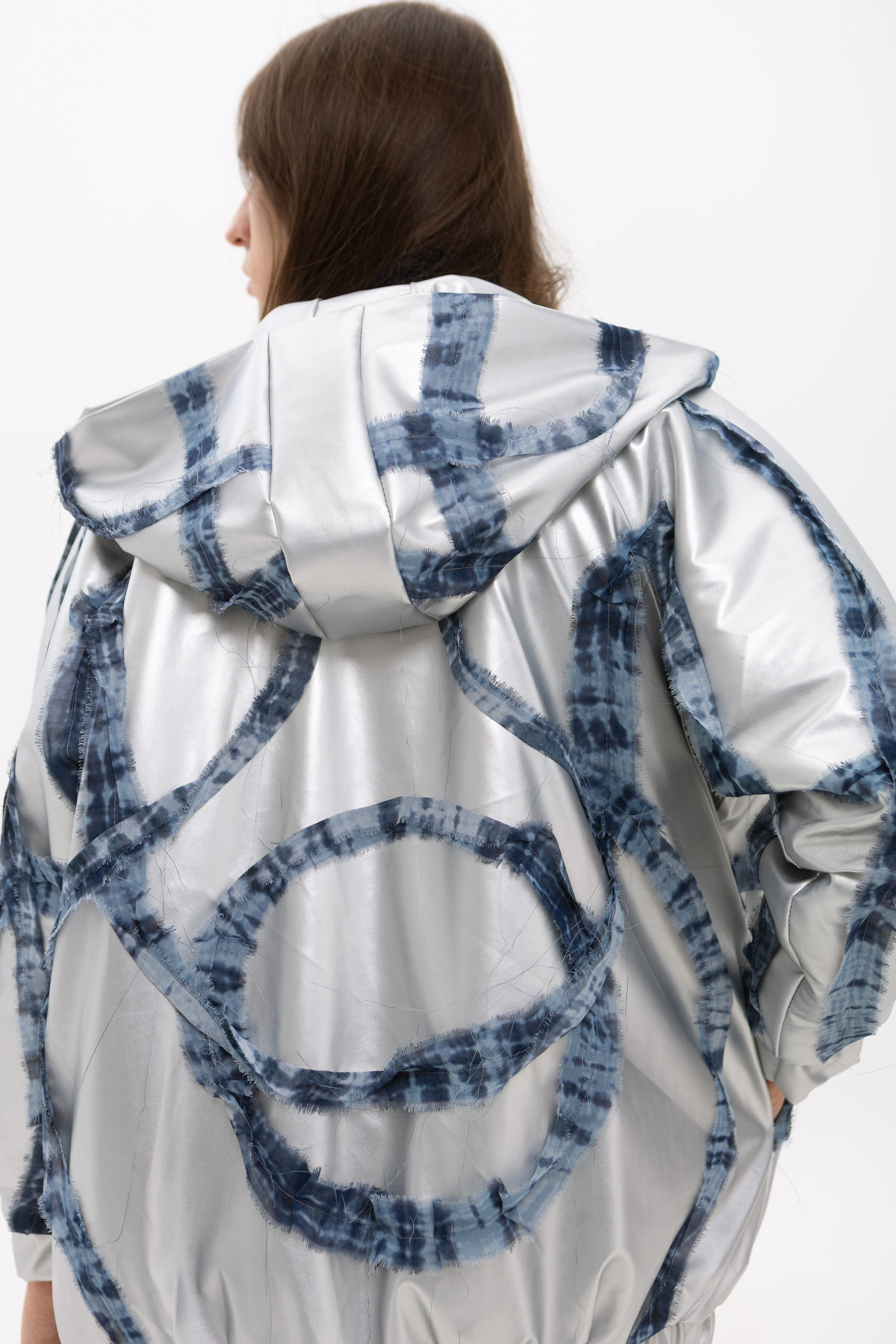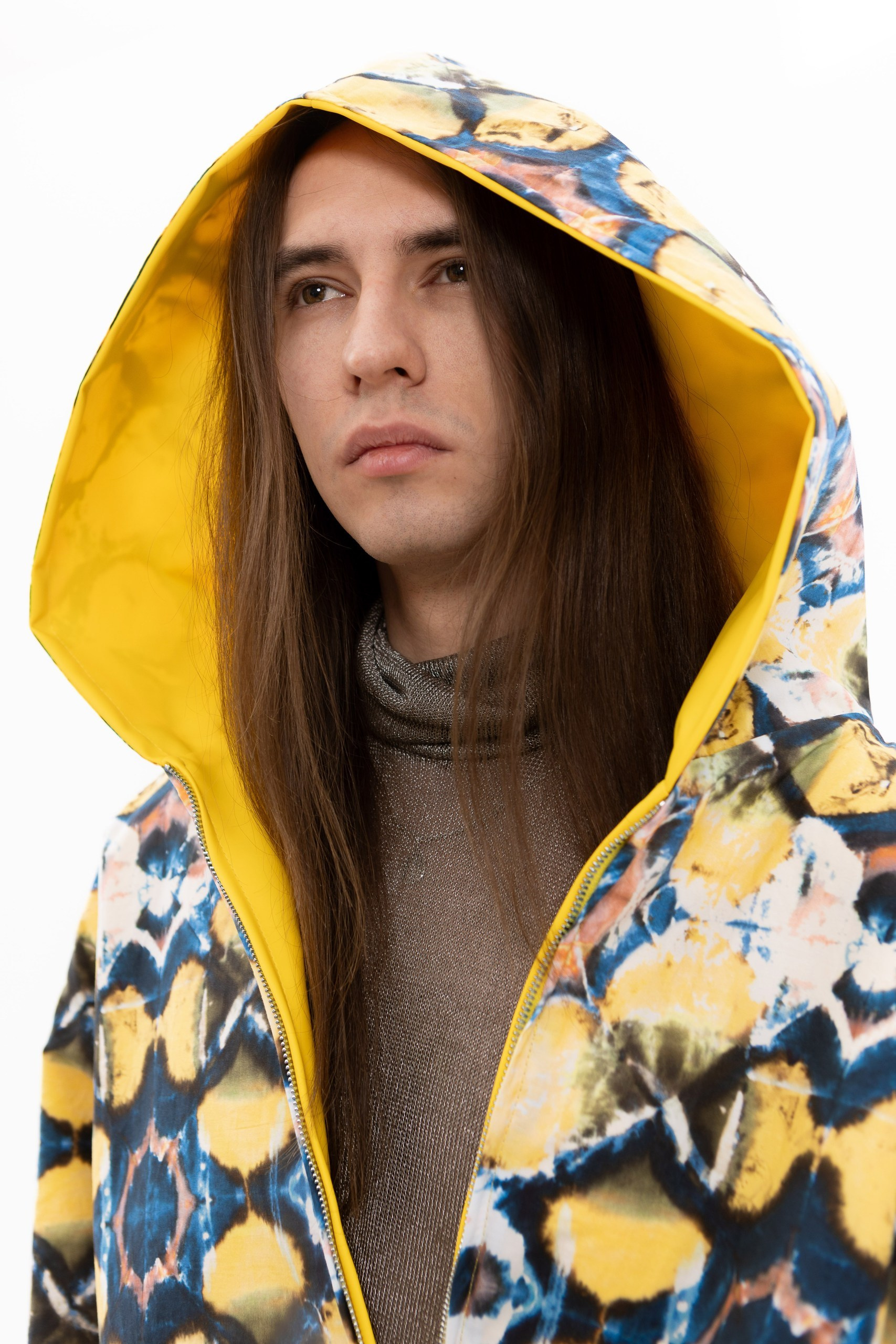 В основе коллекции — эклектика футуризма и экологичности. Нарочито искусственные фактуры, металлизированные поверхности, хромовые оттенки и визуальная «пластичность» тканей соединяются с натуральными, природными и этническими принтами. Полурастительные, полуорганические мотивы вплетаются в футуристичные формы, создавая ощущение трансформации и переходного состояния между естественным и сконструированным. «Слияние» не противопоставляет эти начала, а стирает между ними границы, формируя новую визуальную реальность, в которой искусственное становится продолжением природного, а природное — частью технологичной формы.