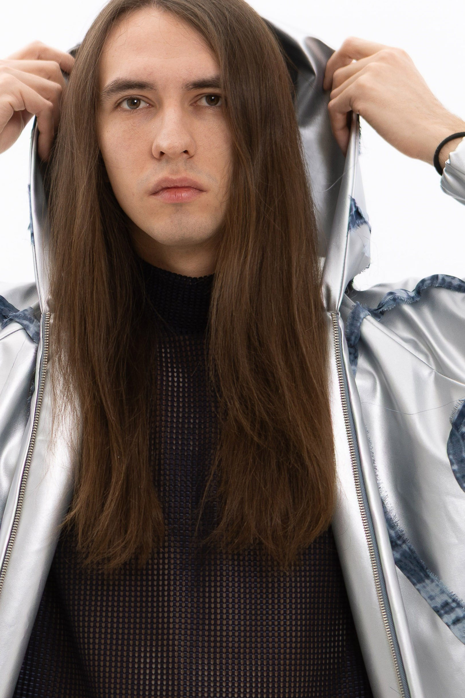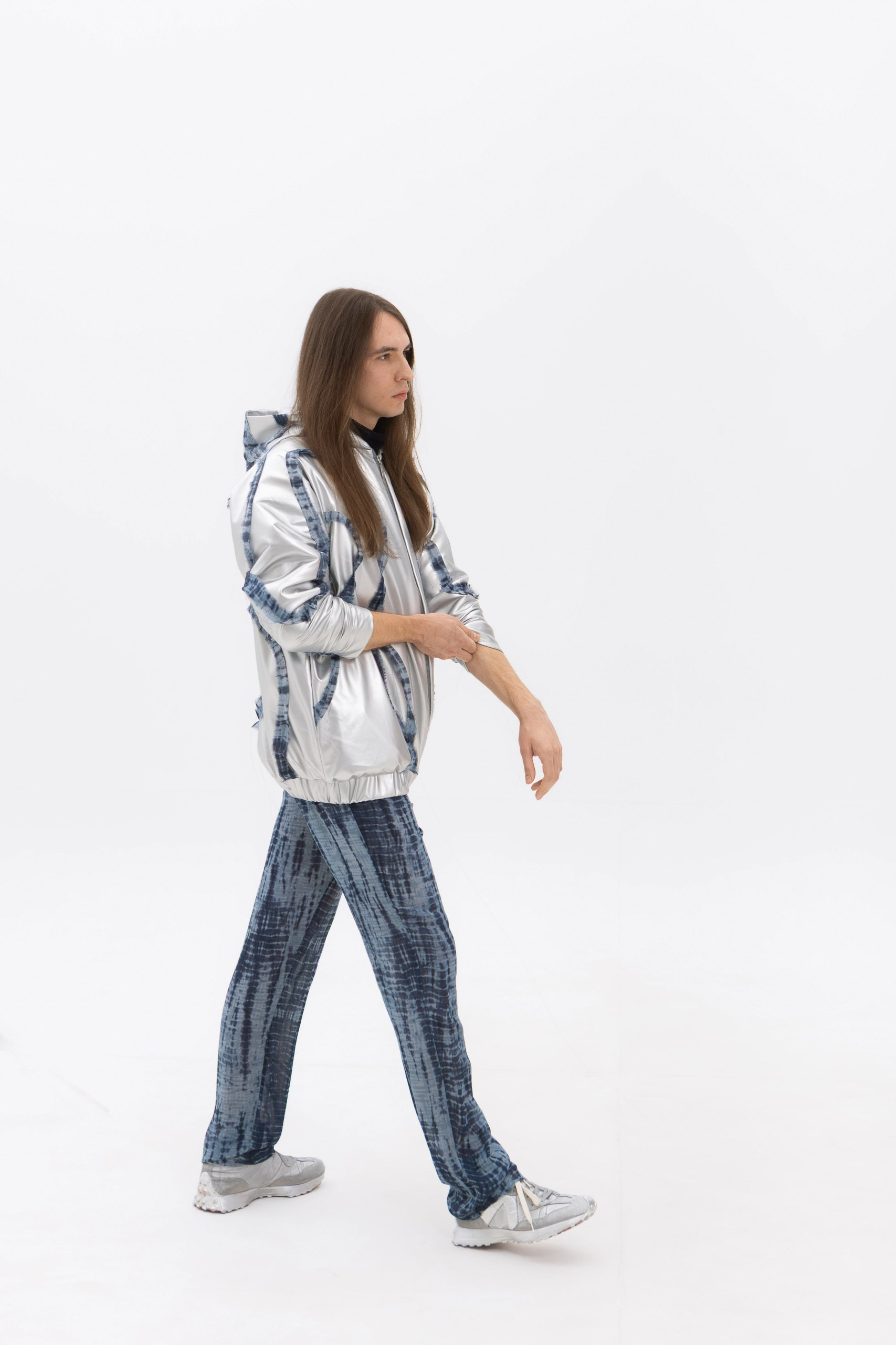 Casual-направление переосмыслено через подиумную стилизацию: необычные пропорции, экспериментальные силуэты и продуманная многослойность создают цельные, взаимосвязанные луки, находящиеся в постоянном диалоге друг с другом. Цветовая палитра построена на контрасте холодных металлических и хромовых оттенков с сдержанными природными цветами. Металлик и искусственные поверхности уравновешены натуральными принтами, подчёркивая ключевую идею коллекции — рождение новой эстетики через слияние противоположностей.